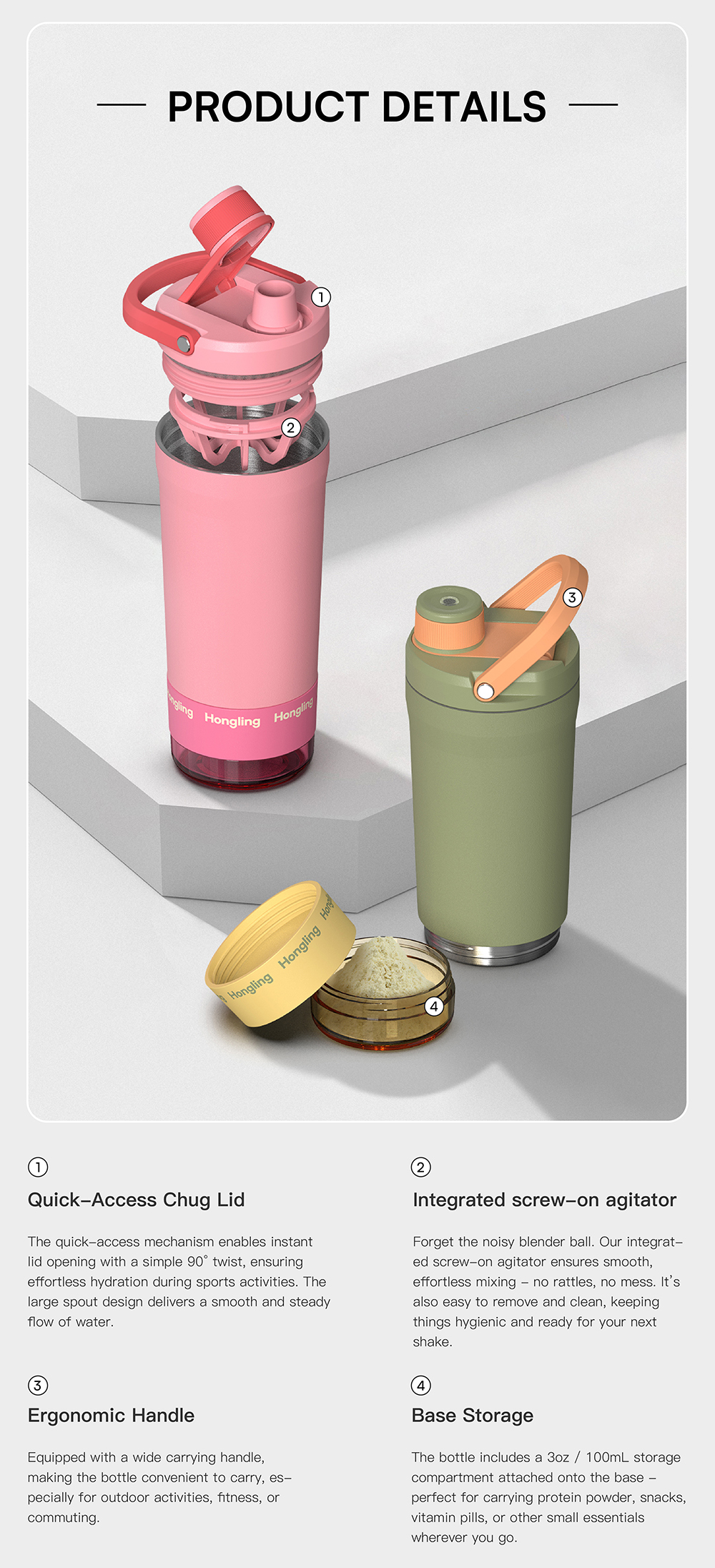 With bottom tank and stirrer,it can hold protein powder,Suitable for fitness enthusiasts