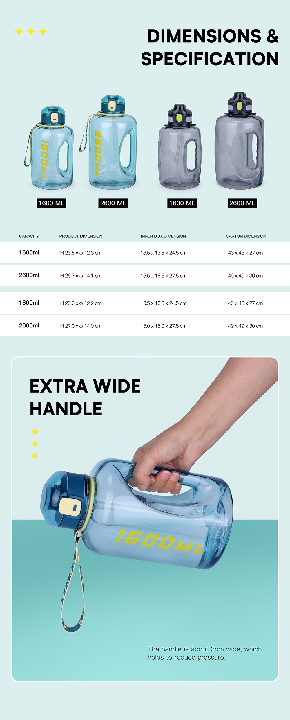 Tritan BPA-Free Water Bottle Made , 1600ML,2600ML, Wide Mouth Plastic Water Bottle with Spout Lid