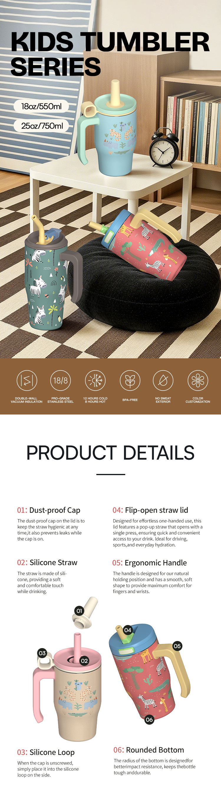 12/18/22oz Perfect Capacity – Meets children’s daily hydration needs, lightweight and easy to carry